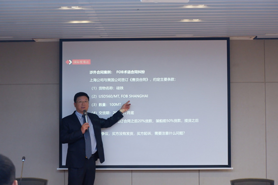 張振安律師以 “涉外經(jīng)貿(mào)合同法律風(fēng)險(xiǎn)和爭(zhēng)議解決”為題進(jìn)行了發(fā)言。他首先通過(guò)介紹一起真實(shí)案例,引出國(guó)際貨物貿(mào)易合同條款中當(dāng)事雙方可能忽略的問(wèn)題。接著,梳理了國(guó)際貨物貿(mào)易合同的簽訂流程,對(duì)每一環(huán)節(jié)可能存在的風(fēng)險(xiǎn)點(diǎn)進(jìn)行了逐一講解,并結(jié)合我國(guó)民法典、國(guó)際貿(mào)易術(shù)語(yǔ)解釋通則(INCOTERMS)、聯(lián)合國(guó)國(guó)際貨物銷(xiāo)售合同公約(CISG)和跟單信用證統(tǒng)一慣例(UCP600),從國(guó)內(nèi)和國(guó)際兩個(gè)層面,對(duì)企業(yè)規(guī)避簽訂涉外貨物買(mǎi)賣(mài)合同過(guò)程中的風(fēng)險(xiǎn)給出了建議。最后,張律師通過(guò)對(duì)比仲裁與訴訟的區(qū)別,對(duì)仲裁作為爭(zhēng)議解決方式之一在國(guó)際貿(mào)易領(lǐng)域的優(yōu)勢(shì)進(jìn)行了詳細(xì)說(shuō)明,并向現(xiàn)場(chǎng)參會(huì)者推薦了貿(mào)仲江蘇中心的示范仲裁條款。