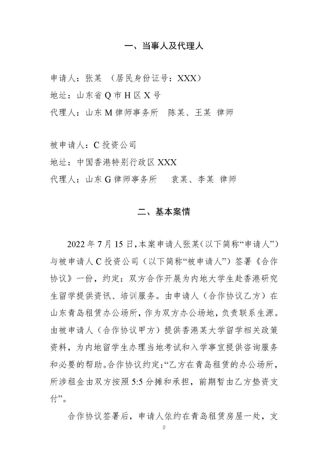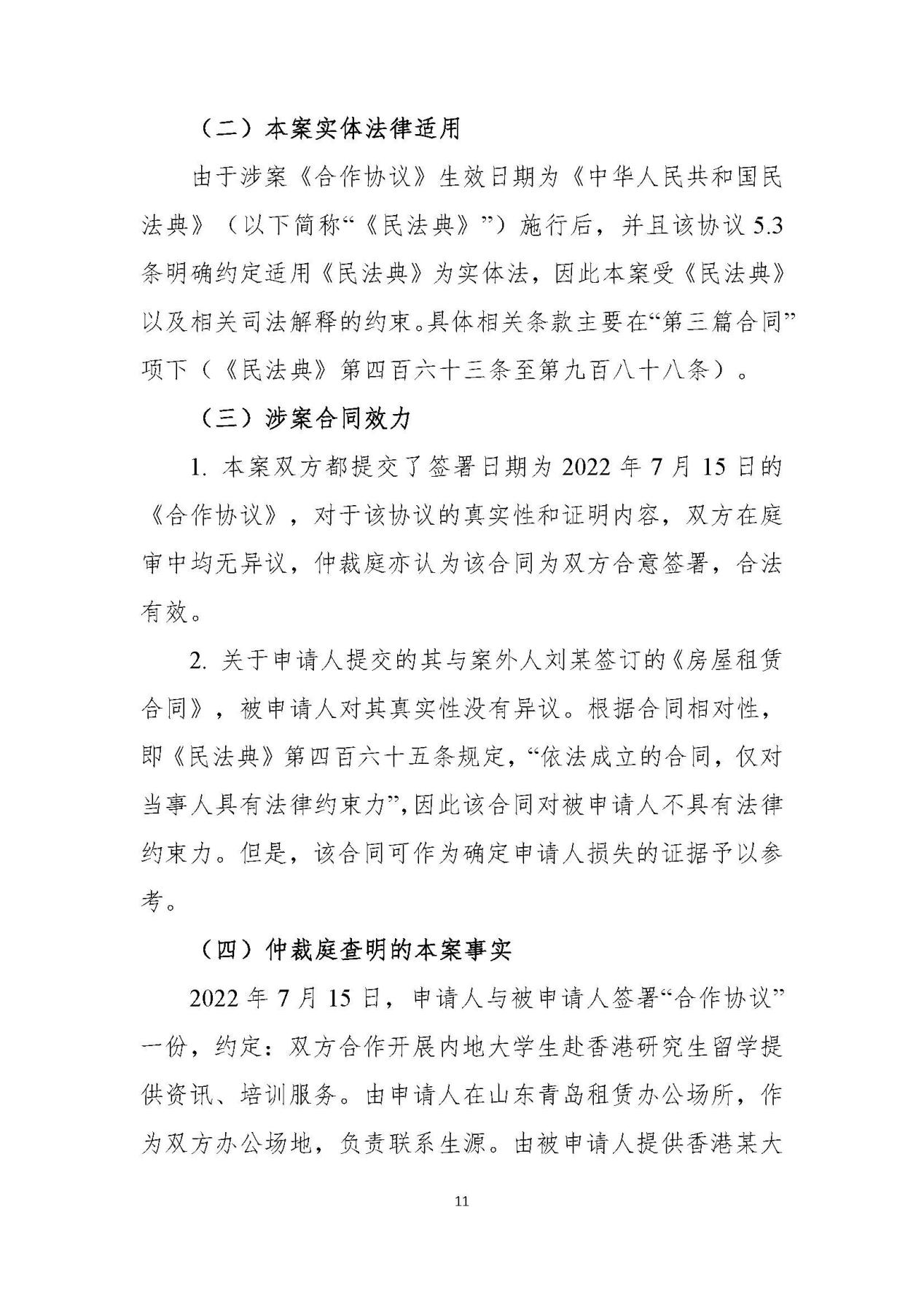 案件涉及一起跨境合作協(xié)議糾紛,申請人為中國內地居民,被申請人為中國香港公司。雙方約定合作開展為內地大學生赴香港研究生留學提供資訊、培訓服務。雙方因合作協(xié)議的履行產生爭議。本案合作協(xié)議“爭議解決”條款明確約定:“因本協(xié)議引起或與本協(xié)議有關的一切爭議,雙方同意以仲裁方式解決,適用《中國海商法協(xié)會臨時仲裁規(guī)則》?!薄爸俨猛ビ梢幻俨脝T組成,仲裁語言為中文,仲裁協(xié)議準據法為香港仲裁法,開庭地點山東青島?!薄氨緟f(xié)議適用《中華人民共和國民法典》為實體法,指定機構為中國海事仲裁委員會或中國海事仲裁委員會青島仲裁中心?!薄爸俨貌脹Q為終局性裁決,雙方同意仲裁裁決在進行脫密處理后,可以由指定機構以適當方式公開?!?/p>