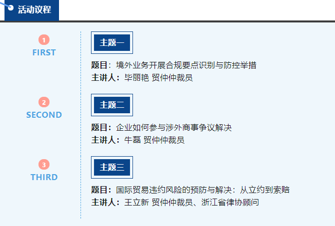 在全球化的商貿(mào)投資環(huán)境中,隨著我國經(jīng)濟主體“走出去”由量到質(zhì)的發(fā)展方向轉(zhuǎn)變,外向型企業(yè)面臨著日益復(fù)雜和多樣化的合規(guī)需求與法律風(fēng)險,包括跨境貿(mào)易、投資、管制合規(guī)、知識產(chǎn)權(quán)合規(guī)、國際法與外國法合規(guī)、違約風(fēng)險管理等。為幫助企業(yè)加強法律風(fēng)險理解與識別、提高合規(guī)與法律風(fēng)險管理能力,擬在浙江省湖州市舉辦“外向型企業(yè)合規(guī)與法律風(fēng)險管理”研討會。