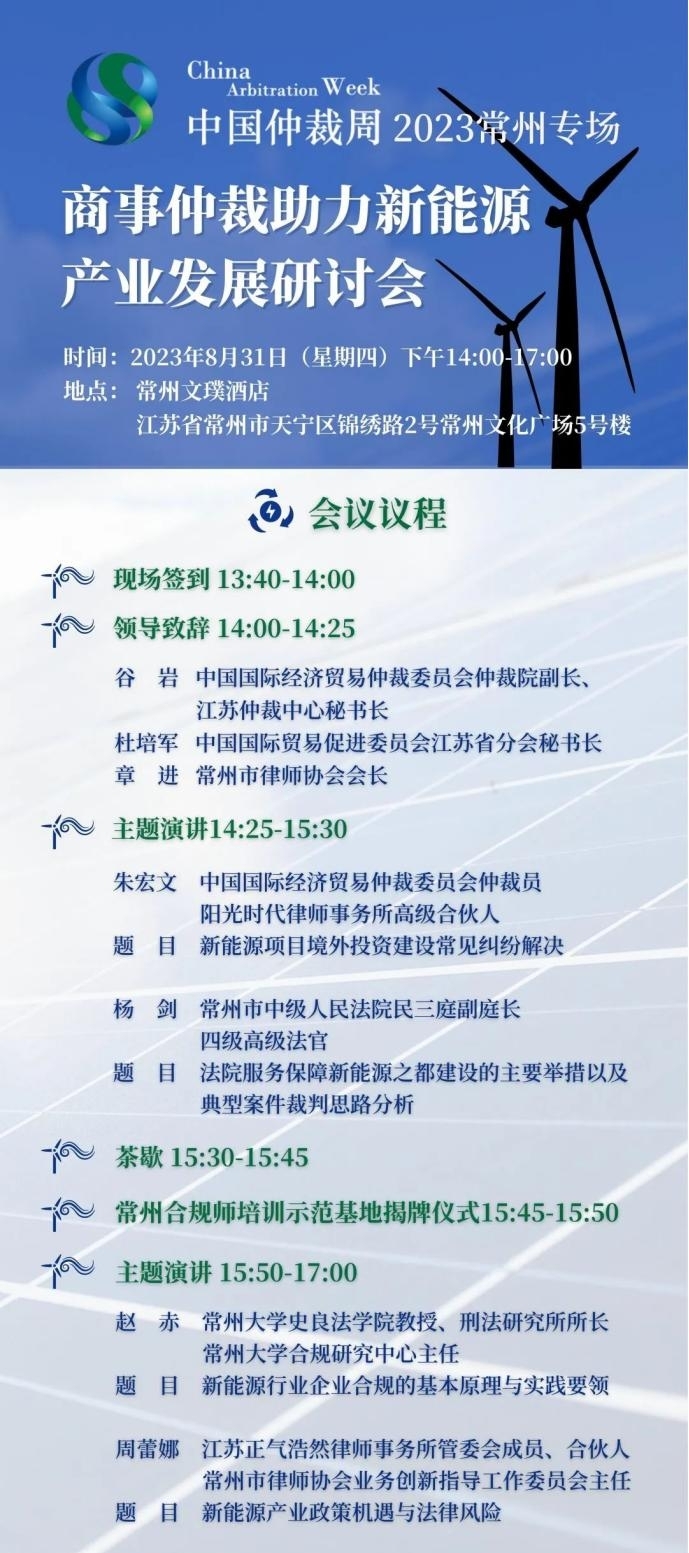 近年來,江蘇省常州市緊扣“國際化智造名城、長三角中軸樞紐”的城市定位,在新能源產(chǎn)業(yè)不斷發(fā)力,著力打造引領(lǐng)長三角,影響全國乃至全球的“新能源之都”。經(jīng)濟(jì)的蓬勃發(fā)展,產(chǎn)業(yè)的日益興旺,離不開良好的營商環(huán)境和制度化、規(guī)范化的法律保護(hù)措施。本次“中國仲裁周”常州專場活動(dòng)——商事仲裁助力新能源產(chǎn)業(yè)發(fā)展研討會(huì),將聚焦新能源產(chǎn)業(yè)熱點(diǎn)問題,幫助企業(yè)進(jìn)一步提升化解國內(nèi)外商事爭議的能力,推動(dòng)建設(shè)公平、高效、法治的市場環(huán)境。