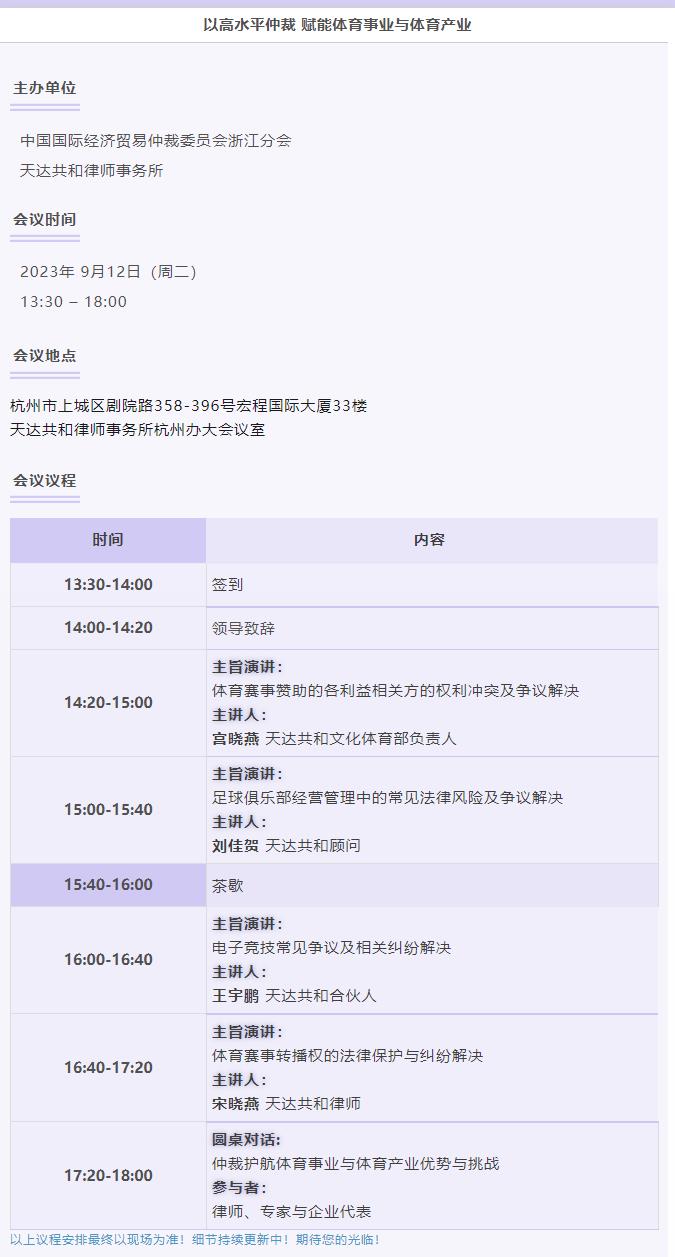 今年6月24日,新修訂的《中華人民共和國(guó)體育法》頒布一周年。一年來(lái),我國(guó)體育仲裁與體育商事仲裁事業(yè)雙雙迎來(lái)快速發(fā)展。值此杭州亞運(yùn)會(huì)盛大召開(kāi)之際,現(xiàn)擬在第十一屆中國(guó)仲裁周期間舉辦專場(chǎng)論壇,深度探討如何以高水平仲裁,賦能體育事業(yè)與體育產(chǎn)業(yè),探索體育糾紛及體育相關(guān)商事糾紛解決路徑,為我國(guó)的體育事業(yè)和產(chǎn)業(yè)發(fā)展提供法律視角、貢獻(xiàn)專業(yè)智慧。