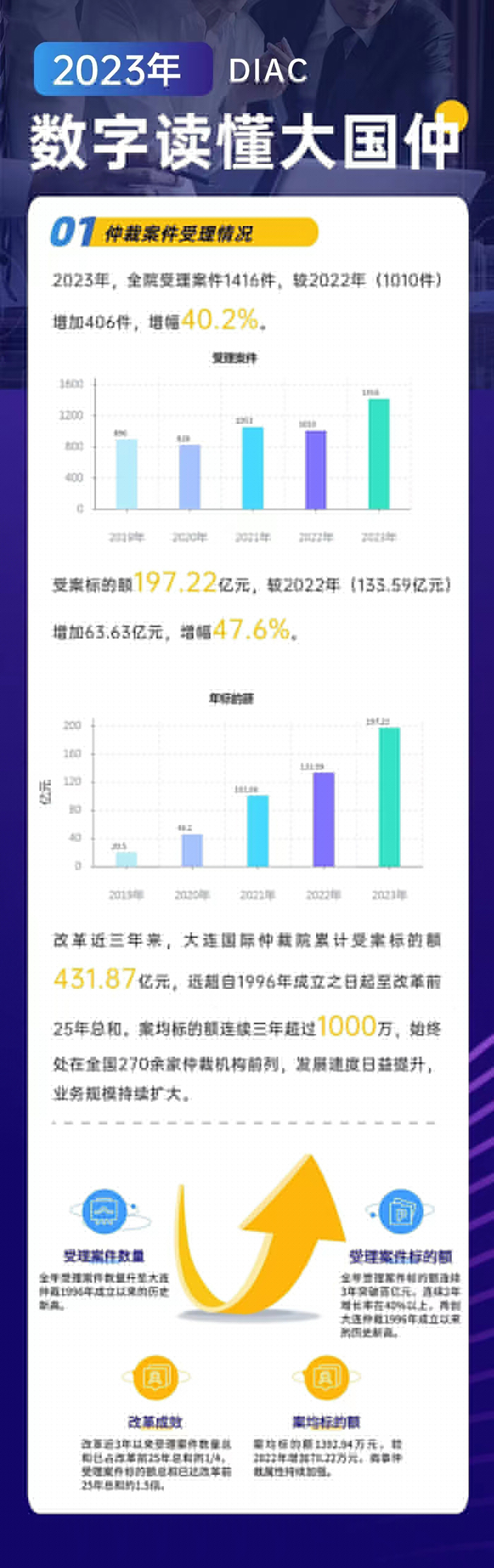 2023年,是大連國(guó)際仲裁院(大連仲裁委員會(huì))順利完成體制機(jī)制改革的第三個(gè)年頭。大連國(guó)際仲裁院堅(jiān)定不移在法治軌道上推進(jìn)大連仲裁發(fā)展體系和能力現(xiàn)代化。全年仲裁業(yè)務(wù)實(shí)現(xiàn)跨越式發(fā)展,辦案質(zhì)效全面提升,公共法律服務(wù)平臺(tái)的輻射面持續(xù)擴(kuò)大,機(jī)構(gòu)品牌的影響力和公信力不斷增強(qiáng)。在推進(jìn)東北亞國(guó)際仲裁中心建設(shè),營(yíng)造優(yōu)質(zhì)的法治化營(yíng)商環(huán)境,擦亮“大連仲裁”的金字招牌上邁出堅(jiān)實(shí)步伐。