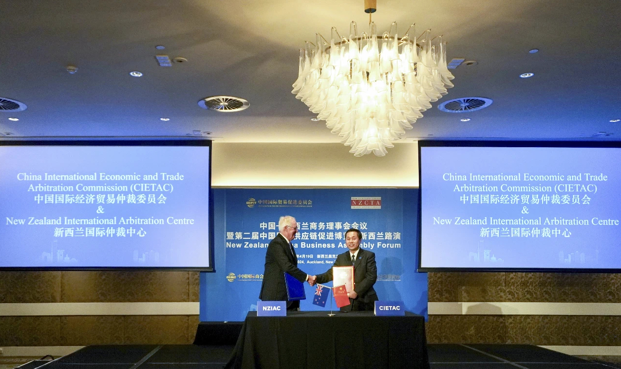 4月19日,在中國貿促會會長任鴻斌率中國企業(yè)家代表團訪問新西蘭期間,中國國際經濟貿易仲裁委員會副主任兼秘書長王承杰與新西蘭國際仲裁中心主任約翰·格林在奧克蘭于第五屆中國—新西蘭商務理事會會議上簽署合作協(xié)議。中國貿促會會長任鴻斌、新西蘭中國貿易協(xié)會主席約翰·考克倫、中國駐新西蘭大使王小龍等出席簽約儀式。