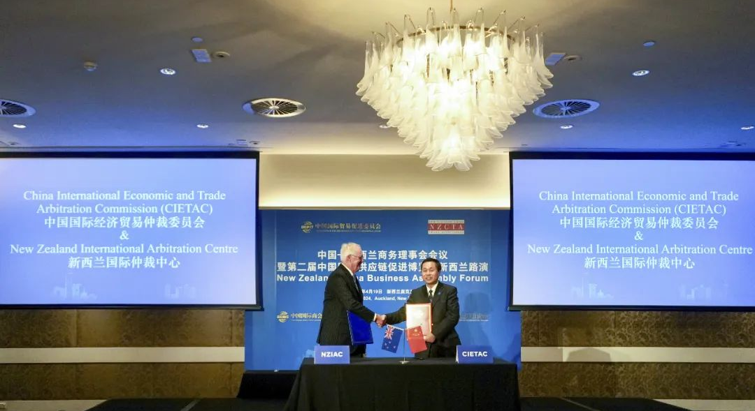 貿(mào)仲代表團出席了由中國貿(mào)促會和新西蘭中國貿(mào)易協(xié)會共同主辦的中國-新西蘭商務(wù)理事會會議暨第二屆中國國際供應(yīng)鏈促進博覽會新西蘭路演。任鴻斌會長出席活動并致辭,新西蘭-中國貿(mào)易協(xié)會主席約翰·考克倫(John Cochrane)、新西蘭貿(mào)發(fā)局大中華區(qū)主任白安祖(Andrew White)、中國駐新西蘭大使王小龍、駐奧克蘭總領(lǐng)事陳世杰等出席活動,中新兩國工商界代表200余與會。會上,貿(mào)仲副主任兼秘書長王承杰與新西蘭國際仲裁中心主任約翰·格林(John Green)代表雙方簽訂了合作協(xié)議。該合作協(xié)議搭建了中新兩國仲裁機構(gòu)的交流平臺,有利于通過共同努力增進中方和新方企業(yè)在仲裁、爭議風(fēng)險防范等方面的認(rèn)識與理解。