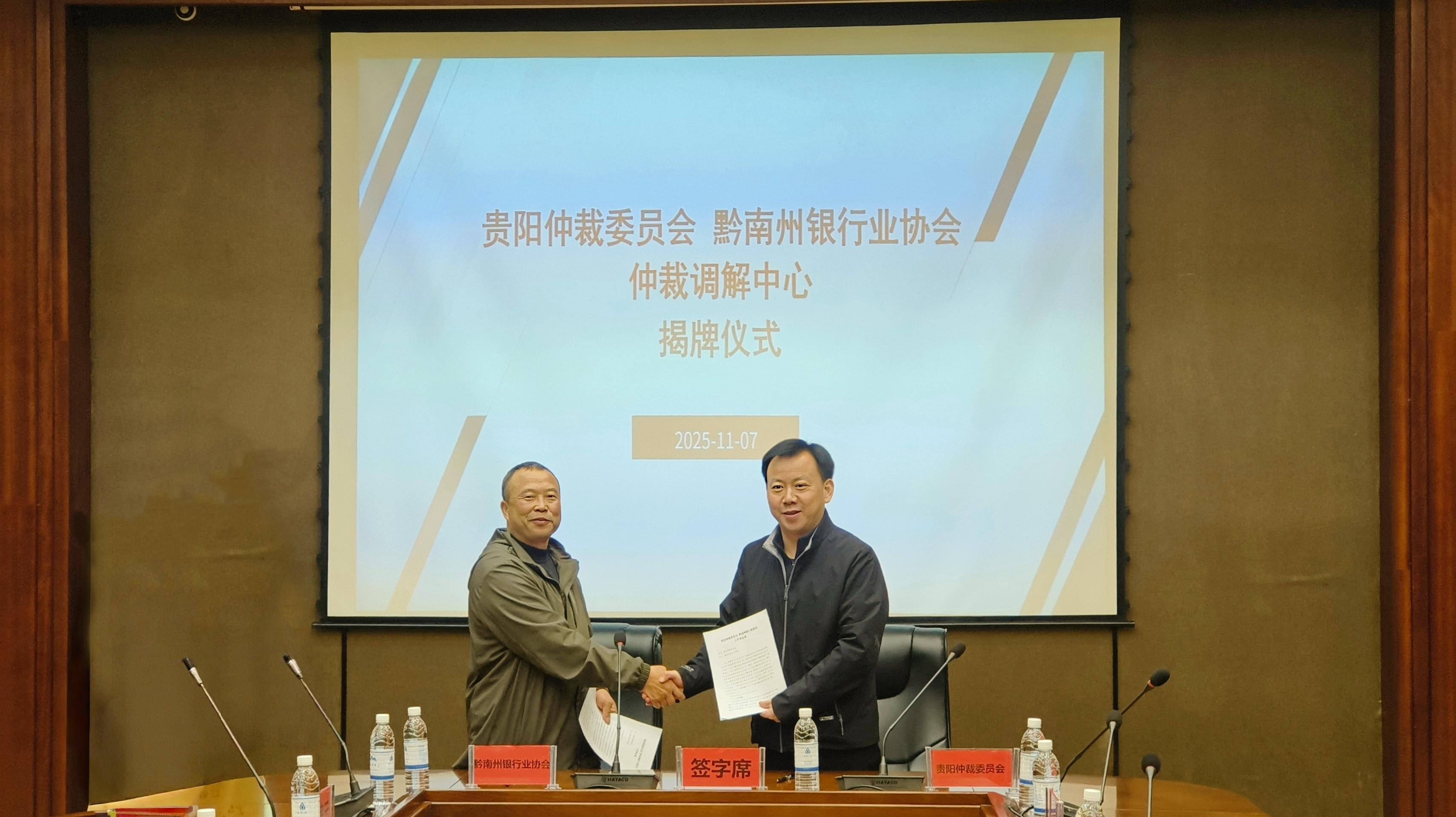 為健全黔南州金融糾紛多元化解機(jī)制,提升金融領(lǐng)域矛盾糾紛化解質(zhì)效,11月7日,“貴陽(yáng)仲裁委員會(huì)黔南州銀行業(yè)協(xié)會(huì)仲裁調(diào)解中心”揭牌儀式順利舉行。貴陽(yáng)仲裁委員會(huì)主任卜貴榮、黔南州金融監(jiān)管分局副局長(zhǎng)劉廷志共同為仲裁調(diào)解中心揭牌,貴陽(yáng)仲裁委員會(huì)副主任王常毅與黔南州銀行業(yè)協(xié)會(huì)秘書長(zhǎng)陳傳勛簽署工作備忘錄。