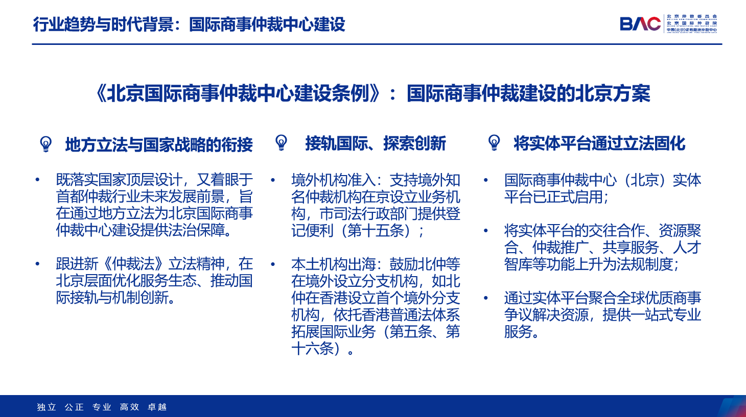 《條例》于2025年9月26日經(jīng)北京市十六屆人大常委會(huì)第十九次會(huì)議表決通過,提出了國(guó)際商事仲裁中心建設(shè)的總體要求,包括優(yōu)化仲裁發(fā)展環(huán)境,支持仲裁改革創(chuàng)新,建設(shè)仲裁制度接軌國(guó)際、資源優(yōu)質(zhì)集聚、機(jī)構(gòu)國(guó)際一流、服務(wù)專業(yè)高效、司法保障優(yōu)良的國(guó)際商事仲裁中心,旨在打造國(guó)際商事爭(zhēng)議解決和法律服務(wù)優(yōu)選地,提升涉外法治保障和服務(wù)水平,助力北京營(yíng)造市場(chǎng)化、法治化、國(guó)際化一流營(yíng)商環(huán)境。