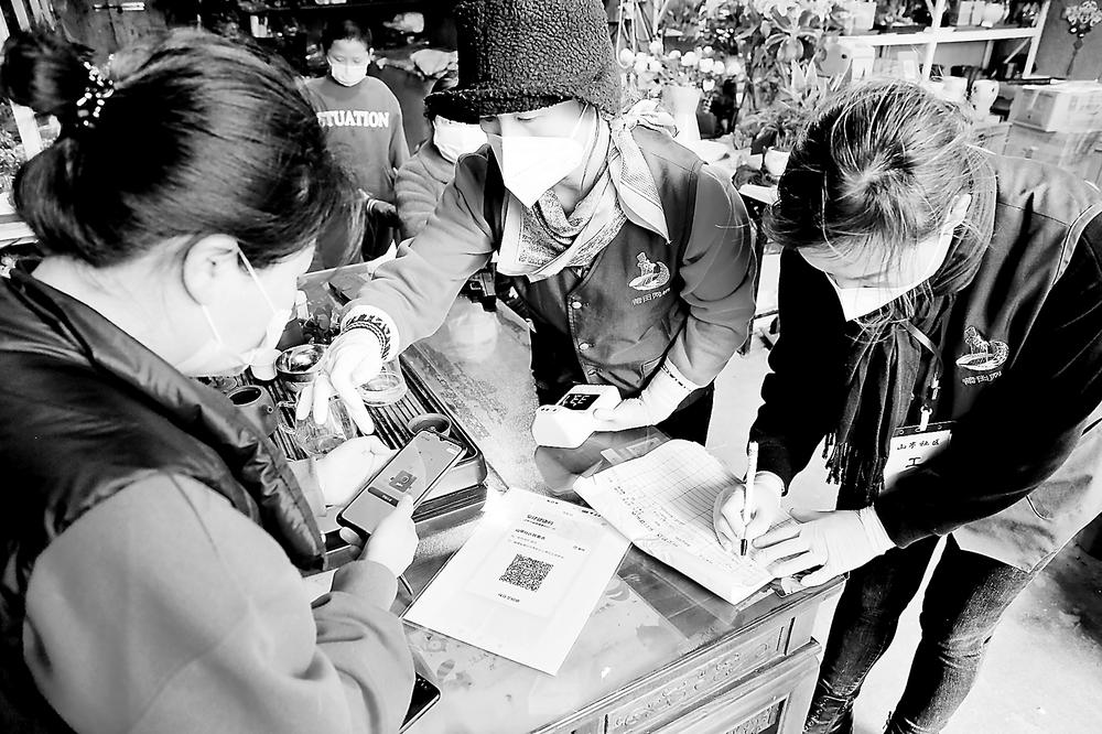 網(wǎng)格員對沿街店面進(jìn)行信息摸排登記。 陳琛 攝