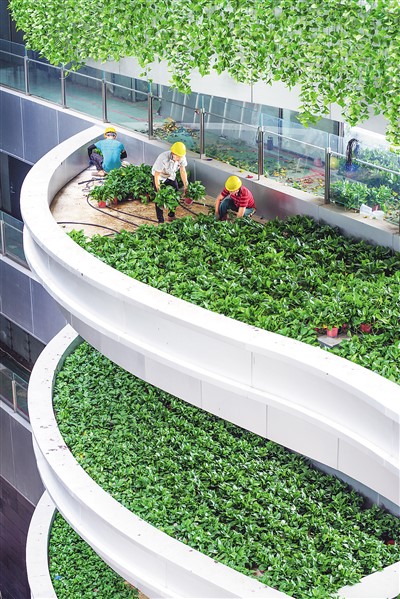 位于海南??诮瓥|新區(qū)起步區(qū)的海南能源交易中心大廈是集智慧、科技、低碳、高效為一體的“智慧辦公場所”,為用戶提供舒適的辦公環(huán)境。圖為大廈施工人員對樓內綠植進行更換。孫士杰攝(人民視覺)