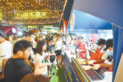 夜幕降臨,華燈初上,時尚酷炫的七彩霓虹閃爍。放眼望去,鮮艷色彩的鋪位棚沿著商業(yè)區(qū)整齊列陣,消夏的市民從四面八方涌來,走進市集頓時被各種美味吸引。擼串兒、吃燒烤、喝啤酒,推杯換盞暢飲,城市煙火氣撲面而來。這里不僅有網(wǎng)紅美食,還設立了日常百貨、文創(chuàng)區(qū)、娛樂區(qū)。