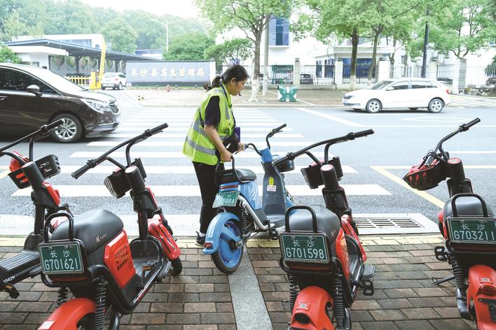 長(zhǎng)沙縣數(shù)字城管信息采集員在路上采集城市管理問題、規(guī)范共享單車停車。 章帝 攝