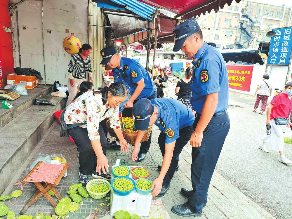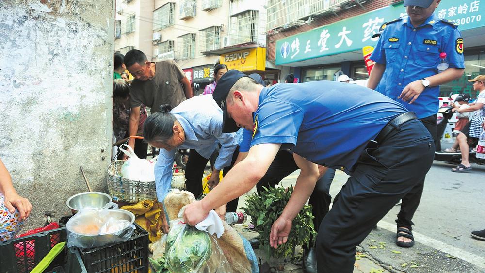 “我們采取延時(shí)、錯(cuò)時(shí),定人、定崗、定責(zé)的工作機(jī)制,安排執(zhí)法隊(duì)員錯(cuò)時(shí)對(duì)農(nóng)貿(mào)市場(chǎng)周邊及臨街門(mén)店開(kāi)展逐一檢查,堅(jiān)決杜絕部分商戶(hù)、流動(dòng)攤販出店經(jīng)營(yíng)、占道經(jīng)營(yíng)和擺放遮陽(yáng)傘阻擋過(guò)道等行為?!痹诮瘗樎繁眰?cè)花板橋菜市場(chǎng)及花鳥(niǎo)路周邊,區(qū)城管局五里牌中隊(duì)通過(guò)采用錯(cuò)時(shí)執(zhí)法和取締一批、歸市一批、疏導(dǎo)一批的辦法,在花鳥(niǎo)路附近的南北樓設(shè)立臨時(shí)疏導(dǎo)區(qū),為自產(chǎn)自銷(xiāo)的菜農(nóng)創(chuàng)造合法的經(jīng)營(yíng)地點(diǎn),通過(guò)耐心宣傳相關(guān)政策規(guī)定,主動(dòng)幫助商戶(hù)搬移占道物品等文明執(zhí)法方式,工作得到廣大商戶(hù)和流動(dòng)攤販的理解及市場(chǎng)周邊百姓的支持。