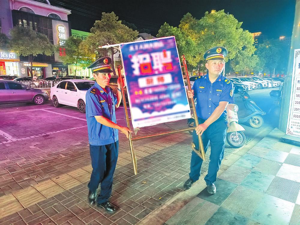 夏季是夜宵燒烤攤點(diǎn)店外經(jīng)營(yíng)、流動(dòng)瓜果散販增多的高峰季節(jié),使得夜間城市管理難度加大?!袄习?,廣告牌不能占道擺放,我們幫您搬進(jìn)店內(nèi)!”8月25日晚8點(diǎn),夜幕來(lái)臨,在磨子山南路,路燈照亮了岳陽(yáng)樓區(qū)城管委城管三大隊(duì)執(zhí)法隊(duì)員忙碌的身影,他們正在對(duì)夜間人流量較大、群眾反復(fù)投訴的重點(diǎn)難點(diǎn)路段和區(qū)域進(jìn)行巡查管控,嚴(yán)防夜市出店經(jīng)營(yíng)、露天燒烤、油煙污染及夜間施工場(chǎng)地?fù)P塵污染、違規(guī)渣土車(chē)無(wú)證運(yùn)輸?shù)葐?wèn)題發(fā)生。