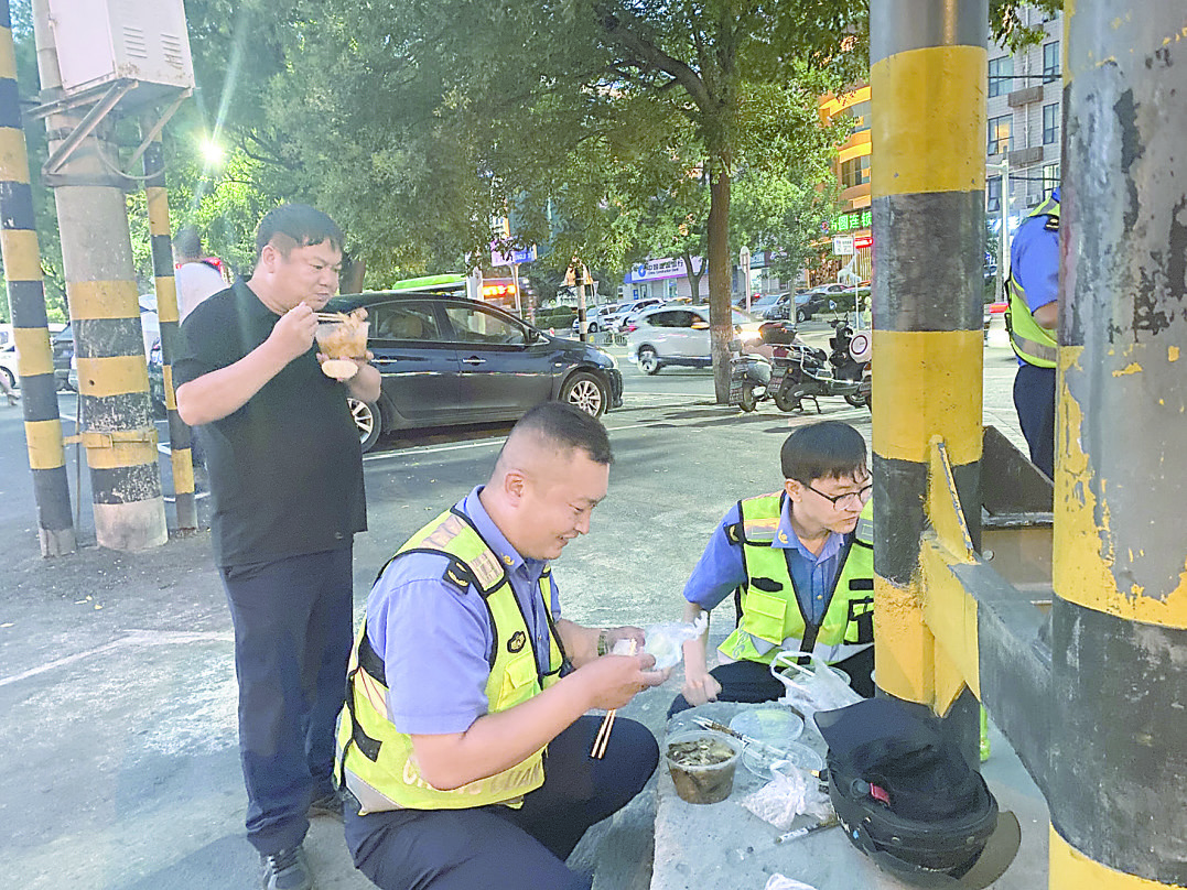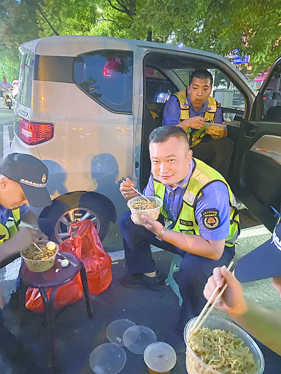 圖③ 山陽區(qū)城管局執(zhí)法一大隊(duì)三中隊(duì)孫玉新(中)吃著加班餐,疲憊的臉上依然擋不住對工作的熱愛。