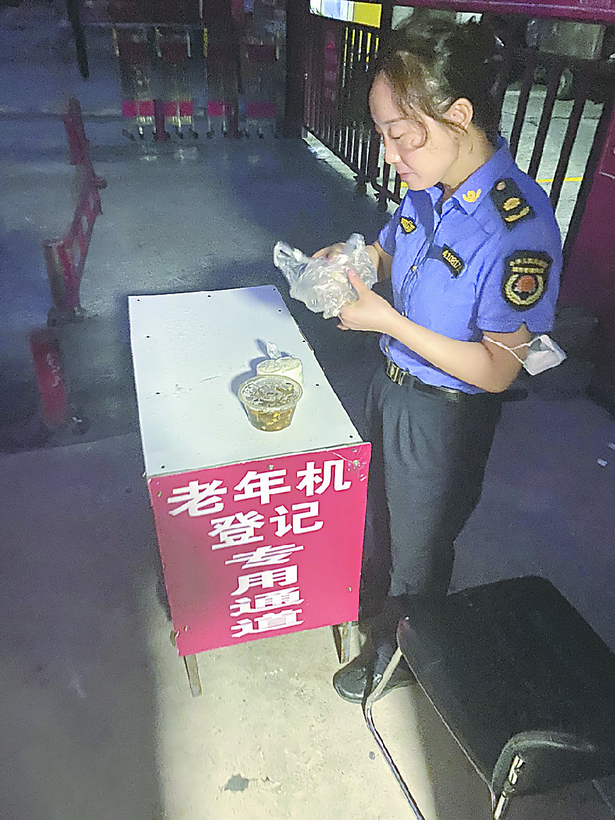圖⑤ 山陽區(qū)城管隊(duì)員耿玉敏利用老年機(jī)登記臺就餐。