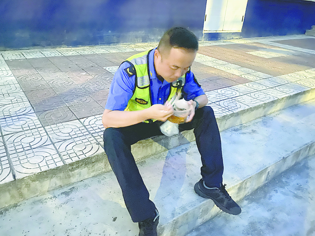 圖① 山陽區(qū)城管隊(duì)員王鵬坐在馬路臺階上就餐。
