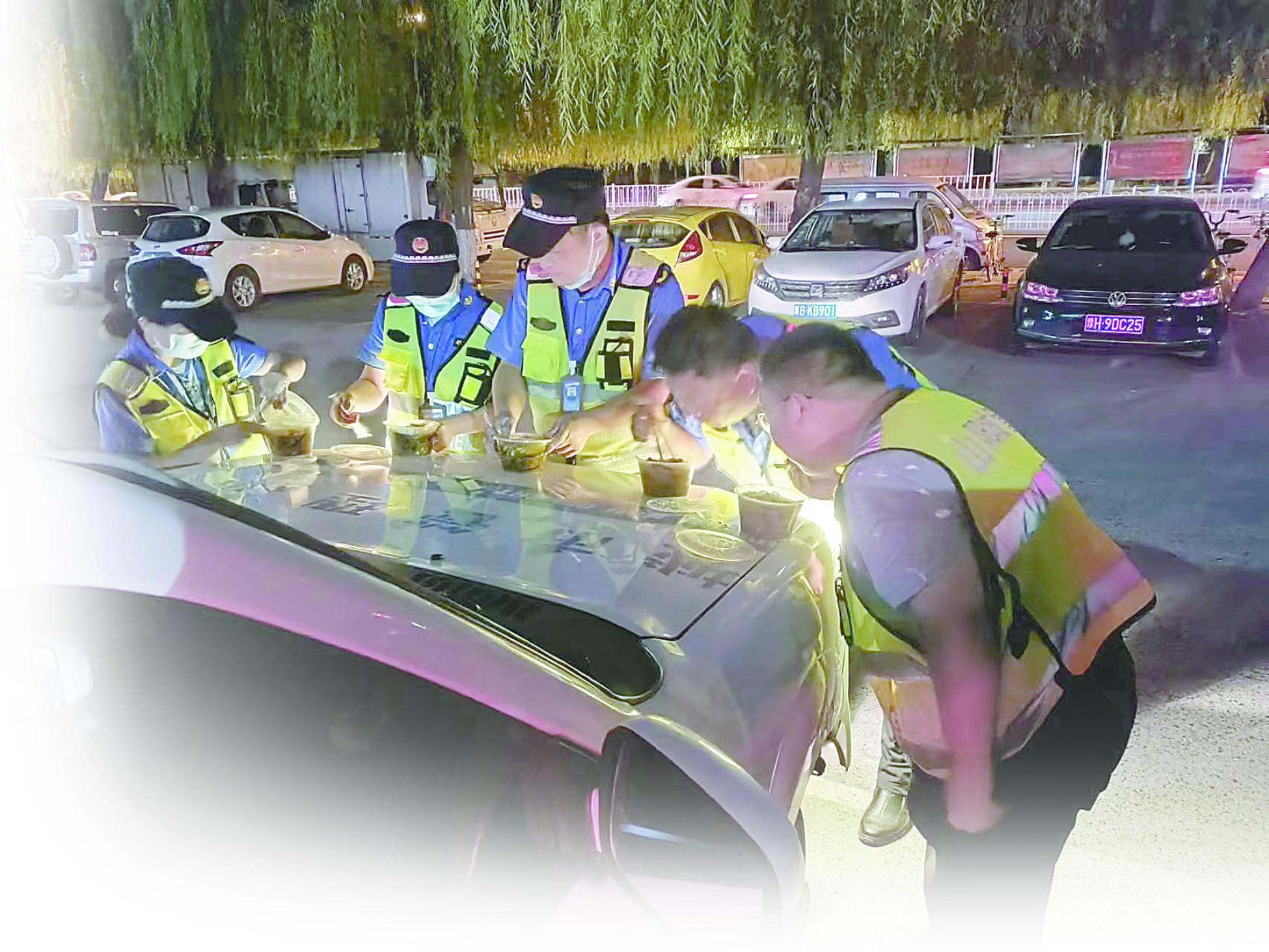 圖④ 山陽區(qū)城管局執(zhí)法三中隊(duì)隊(duì)員用車頭當(dāng)臨時“餐桌”,夜色下燈光很美,但他們就餐的姿勢更美。