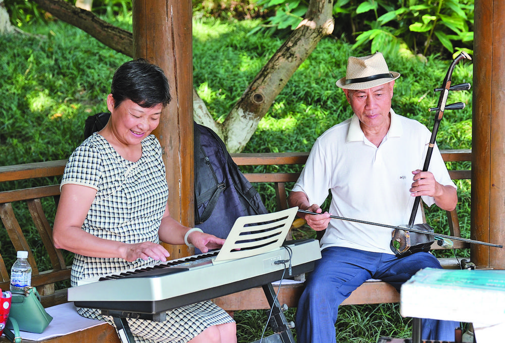 ⑤市民在江濱公園的涼亭里演奏樂器。