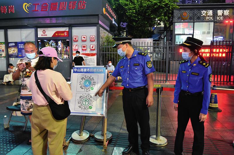 ▲城管執(zhí)法隊員在中山路夜市巡查提醒市民掃碼做好疫情防控
