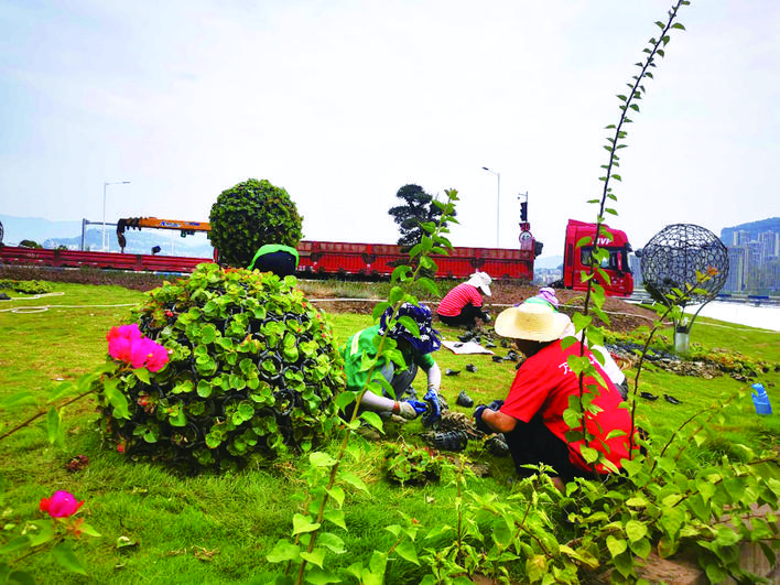 日前,記者在王牌路口節(jié)點看到,園林工人們正在這里換種鮮花,將草坪中間造型上布滿四季海棠,讓鮮花形成鮮艷的花球。在天仙湖攔砂壩,鞍式花箱中替換成了太陽花,花朵盛開嬌艷美麗,與仍在綻放的三角梅相映成趣,在城市高樓長街、萬安大橋、一江碧水的大背景下自成風景線。