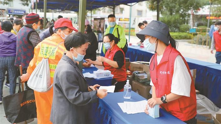 志愿者向居民發(fā)放創(chuàng)建文明城市宣傳手冊。