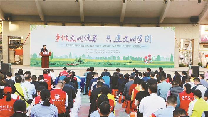 從夜幕中用汗水和心血扮靚城市容顏的環(huán)衛(wèi)工人,到苦口婆心勸說攤主文明經(jīng)營的執(zhí)法人員;從“不是一家人,勝似一家親”的志愿者,到自覺清理樓道垃圾的普通居民……今日的光明街道,全民參與創(chuàng)建的熱情與日俱增,“做文明人”的理念早已深入人心,“文明共創(chuàng),和諧共建,全民共享”蔚然成風(fēng)。