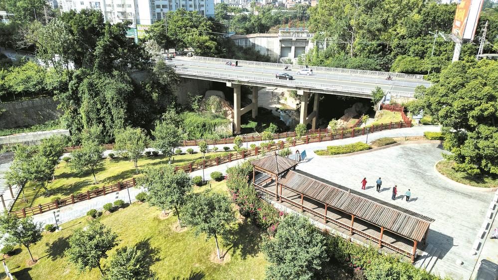 步道干凈整潔、河溝清水流淌、鳥鳴聲清脆悅耳……每天一大早,居住在城區(qū)維林市場的居民羅壽豐都會帶孫子到草鞋溝生態(tài)公園散步。這里樹木成蔭,綠草遍地,大小不一的鵝卵石錯落鋪設(shè)在步道一側(cè),醒目的紅漆圍欄點綴著河溝兩岸的綠茵植被,一片秋意盎然。
