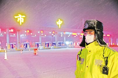 風(fēng)雪夜里交警扼守泉城南大門。(呂傳泉攝)