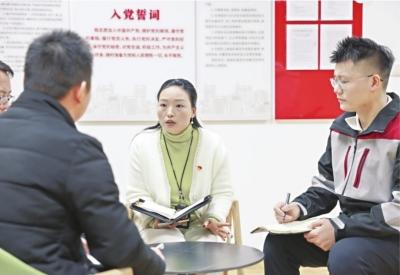 武漢順衡速運(yùn)黨支部書記張麗(右二)為入黨積極分子答疑解惑。記者 胡冬冬 攝