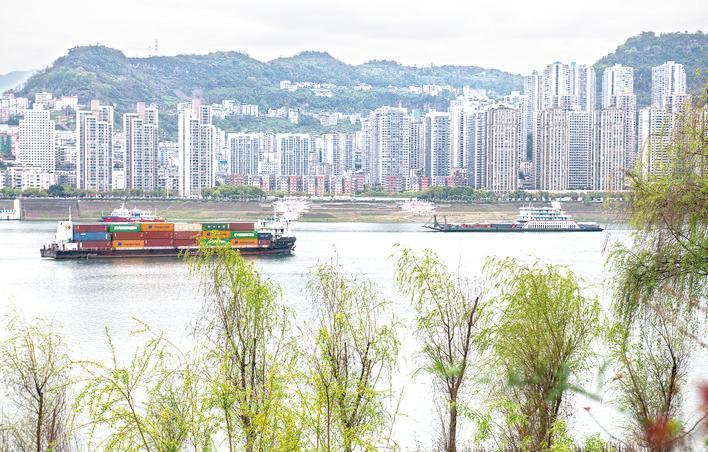 萬州區(qū)南濱公園,長(zhǎng)江消落帶上綠色植被和過往船只交相輝映。冉孟軍/圖