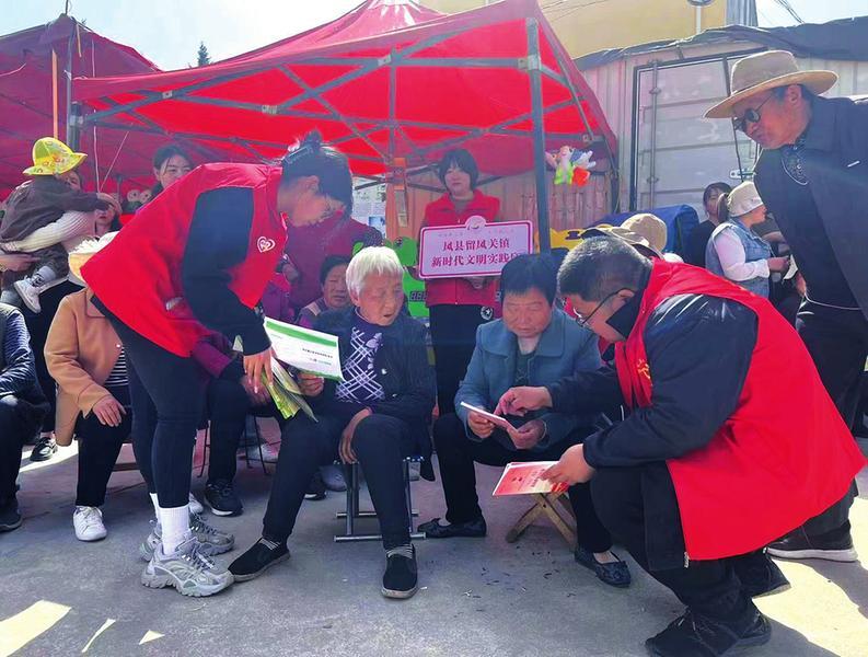 寶雞市鳳縣留鳳關(guān)鎮(zhèn)三岔村近日舉辦了“三月三”物資交流會(huì),鎮(zhèn)上針對(duì)會(huì)期群眾相對(duì)集中、人流量大、信息傳遞密集的特點(diǎn),組織鎮(zhèn)市場(chǎng)監(jiān)管所、派出所、財(cái)政所、司法所等單位,開(kāi)展系列政策宣傳活動(dòng),免費(fèi)發(fā)放惠民惠農(nóng)一卡通,乘車(chē)安全、養(yǎng)老保險(xiǎn)宣傳資料和生活用品,并為群眾測(cè)血糖、量血壓等,在秦腔演出過(guò)程中還穿插宣傳黨建相關(guān)知識(shí),把黨的創(chuàng)新理論送到人民群眾心坎上,使農(nóng)貿(mào)集市充滿(mǎn)了時(shí)代氣息,變成一個(gè)“文明集市”。(記者 馬慶昆 攝)
