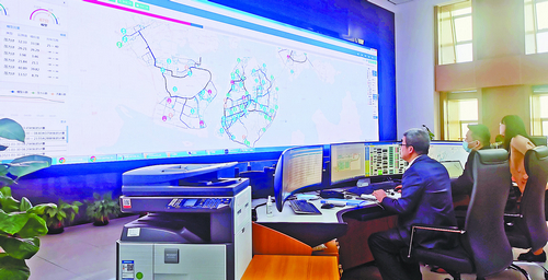 在廈門(mén)市政水務(wù)集團(tuán)調(diào)度中心,工作人員通過(guò)供水管網(wǎng)實(shí)時(shí)仿真系統(tǒng),就能掌握管網(wǎng)運(yùn)行狀態(tài)。(廈門(mén)市政水務(wù)集團(tuán) 供圖)