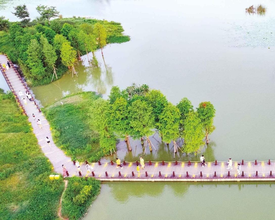 可利江濕地明月湖公園風(fēng)光宜人。 記者 梁楓 攝
