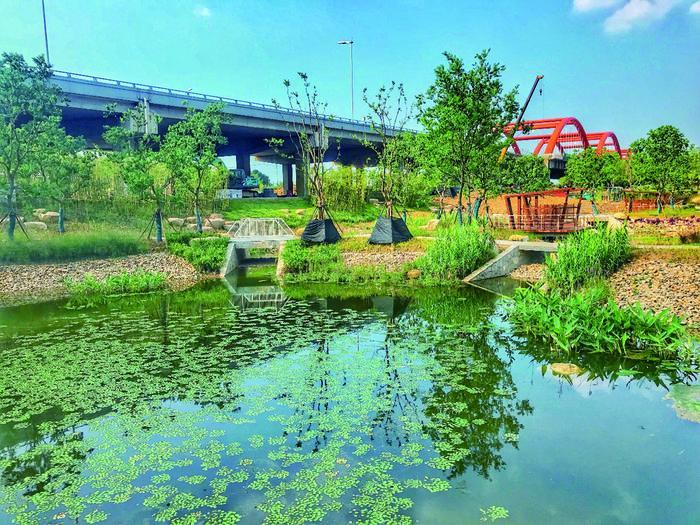 在公園的下游水系與涂家營(yíng)溝河道交接處設(shè)置了雨水泵房,旱季通過上游補(bǔ)水滿足景觀水位需求,汛期則通過雨水泵房實(shí)現(xiàn)蓄水排水。此外,公園采用透水鋪裝、植草溝、雨水濕地等綠色海綿設(shè)施,使雨水迅速滲入地表,降低暴雨期間地表徑流的峰值流量。