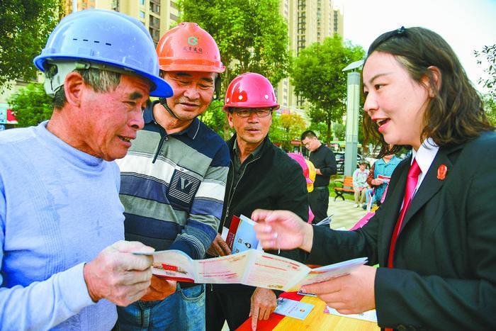 近日,江蘇省鎮(zhèn)江市相關(guān)部門聯(lián)合開(kāi)展“送法進(jìn)工地,法援伴我行”活動(dòng),工作人員和律師走進(jìn)轄區(qū)建設(shè)工地,向外來(lái)務(wù)工人員普及《中華人民共和國(guó)民法典》《保障農(nóng)民工工資支付條例》等法律法規(guī)知識(shí)和維權(quán)援助方法,增強(qiáng)工人們的法治意識(shí)。圖為法院工作人員為外來(lái)務(wù)工人員講解法律維權(quán)知識(shí)。(石玉成)