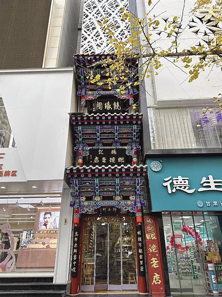 榫卯鑲嵌、手工木雕、精致彩繪、金箔貼邊,在張掖路步行街上,楊記眼鏡行的門樓招牌格外亮眼,雖然只有三四米寬的窄小門面,但店外從上而下的三塊古韻招牌彰顯出這家店的“不簡單”?!白钕旅孢@塊‘澤玉軒’的招牌是我家祖輩楊澤玉開創(chuàng)這家眼鏡行時(shí)留下的字號(hào)”,楊記眼鏡行是蘭州一家老字號(hào)的石頭眼鏡售賣和維修小店,光是制作修理石頭眼鏡這項(xiàng)手藝就已經(jīng)傳到了第五代,其店鋪在二十世紀(jì)八九十年代就獲得過商務(wù)部的“中華老字號(hào)”認(rèn)可。