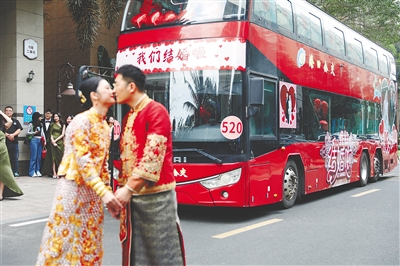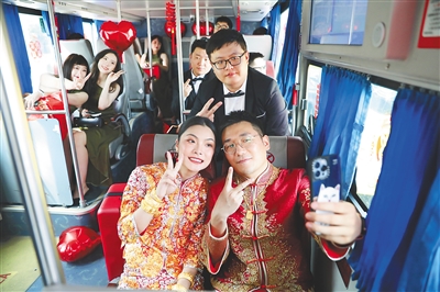 “結(jié)婚當(dāng)天,大家需要張羅的事很多,需要早起,會擔(dān)心司機疲勞駕駛,大巴車剛好就解決了這個煩惱?!比ツ?2月28日結(jié)婚的李媛媛也選擇了大巴車迎親。她說,現(xiàn)在年輕人結(jié)婚,追求婚禮簡約、熱鬧,大巴車安全又環(huán)保就成為他們迎親車輛選擇的重要考慮之一。看到也有很多新人選用大巴車迎親,她和丈夫胡先生也有了嘗試的想法。誰料想,這個提議得到雙方父母的贊同?!凹依锏挠H戚都很贊同,大家可以坐在大巴車內(nèi)互動交流,氛圍非常好?!崩铈骆抡f,與傳統(tǒng)迎親車隊相比,租用大巴車更加經(jīng)濟實惠。