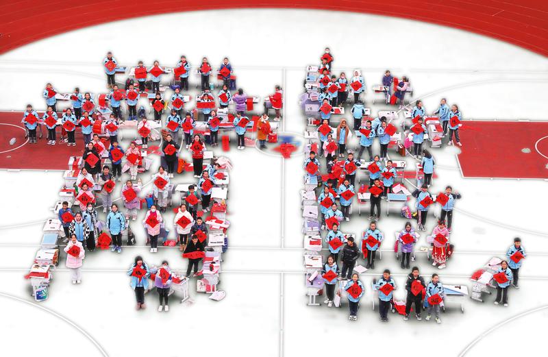 南寧市青秀區(qū)星湖學(xué)區(qū)開展“我家春聯(lián)我書寫”活動。在主會場,學(xué)生排列成繁體“龍”字等隊形,在書法家們的帶領(lǐng)下?lián)]毫潑墨,寫下翰墨飄香的祝福。(楊春發(fā) 攝)