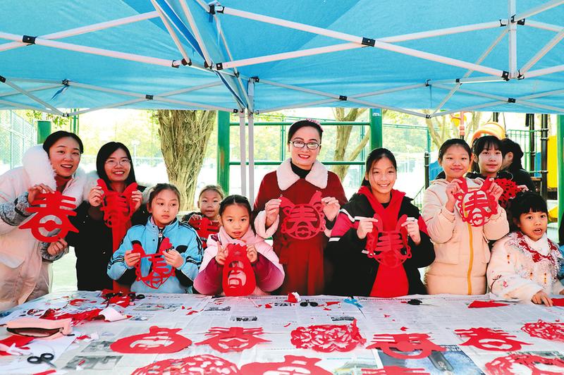 南寧市榮和實驗學(xué)校攜手社區(qū)、物業(yè)開展“欣欣向榮迎新年 文明實踐樹新風(fēng)”志愿服務(wù)活動,黨員教師、少先隊員代表現(xiàn)場揮毫潑墨書寫春聯(lián)和“福”字、剪窗花,表達對新年的美好祝愿和對美好生活的向往。(嚴文娟 攝)