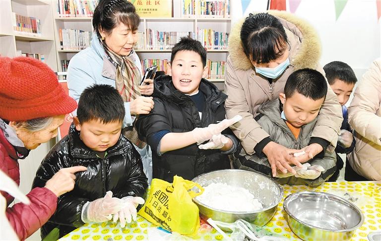 2月22日,韓森寨街道咸?hào)|社區(qū)組織轄區(qū)居民群眾,通過猜燈謎、滾元宵、畫年畫、做游戲等方式,在歡聲笑語中共迎元宵佳節(jié)。圖為工作人員與居民一同制作元宵 記者 雷偉東 攝
