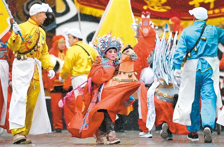2月22日,在隴州社火過大年活動(dòng)中,來自高陵區(qū)的社火隊(duì)在表演藥惠竹馬。新華社記者 劉瀟 攝