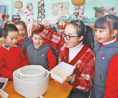 近日,浙江省臺州市路橋區(qū)中心幼兒園的老師帶小朋友認識糧食,培養(yǎng)愛糧節(jié)糧的意識。蔣友青 蔣歆慧 攝(人民視覺)
