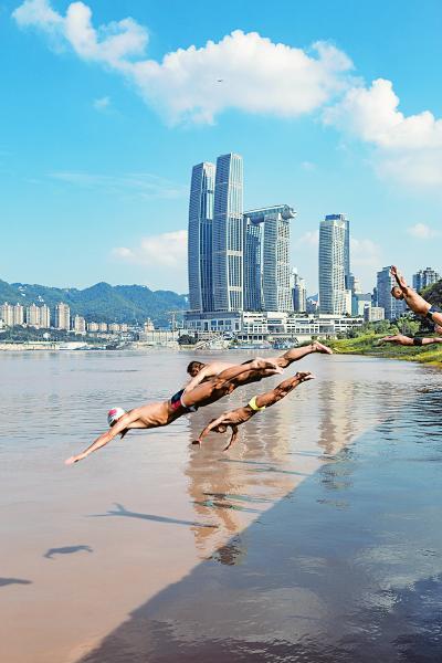 江邊“起飛” 重慶梁沱冬泳義務救援基地,游泳愛好者在練習跳水。