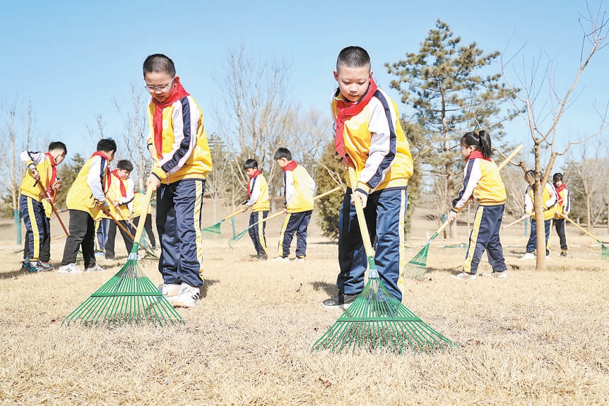 3月12日上午,“運河小林長3·12綠地大掃除”在城市綠心森林公園舉行。北京第二實驗小學通州分校的學生們學習義務植樹知識,并進行現(xiàn)場撫育管護活動。記者 白繼開 攝