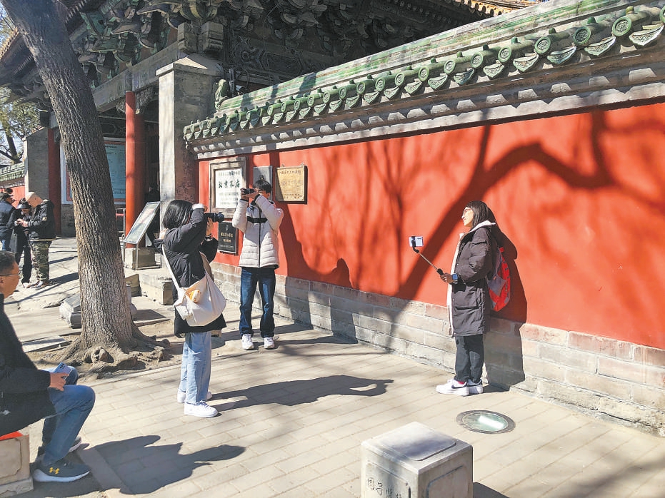 今年春節(jié)期間,國(guó)子監(jiān)街恢復(fù)了游客摩肩接踵的熱鬧,日均游客量達(dá)到了三四萬(wàn)人次。春節(jié)過(guò)后,隨著氣溫回升,周末的單日客流量也能達(dá)到1.5萬(wàn)人次??讖R的紅墻下、國(guó)子監(jiān)街的牌樓前,隨處可見(jiàn)中外游客拍照打卡的身影。
