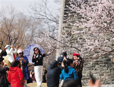 3月18日,明城墻遺址公園,市民與山桃花合影。記者 王貴彬 攝