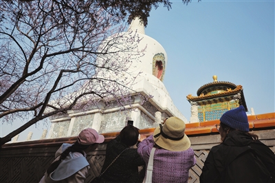 3月18日,北海公園,白塔下盛開的山桃花。記者 薛珺 攝
