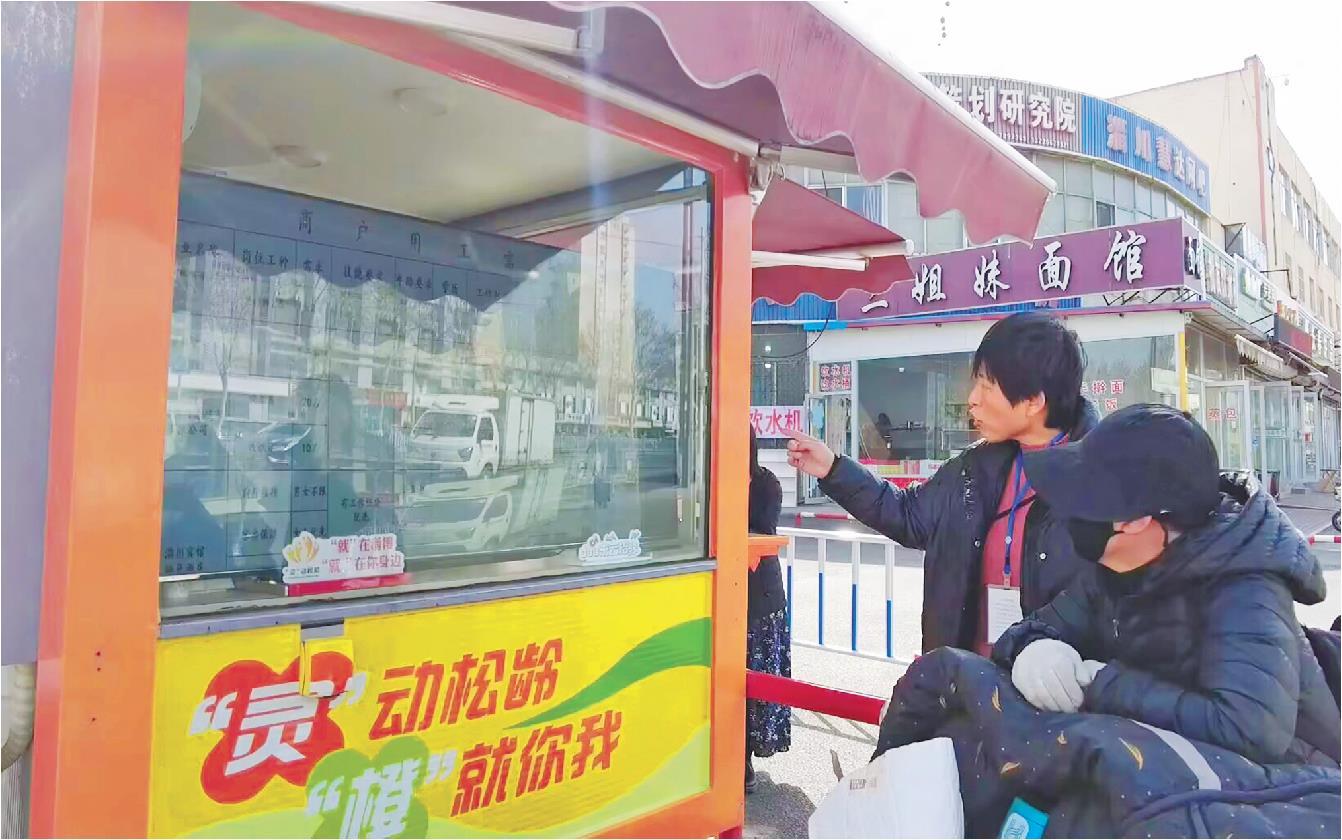 近日,求職者在淄博市淄川區(qū)松齡路街道的就業(yè)小亭前瀏覽招聘信息。