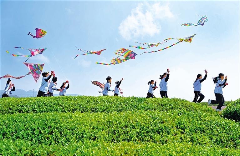 4月9日,浙江省武義縣三角店小學學生在滿眼翠綠的茶園里放飛風箏,樂享春光。張建成 攝(中經視覺)