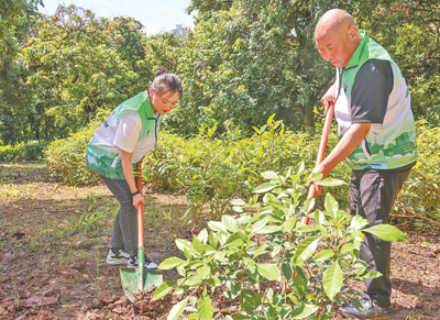 潘艷(左)在綠芽低碳森林參與公益植樹志愿服務活動。