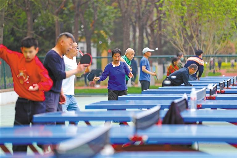 西安城市運動公園是市民參與全民健身的重要場所之一。圖為5月7日,市民在西安城市運動公園健身廣場打乒乓球。 記者 肖陽熠 攝